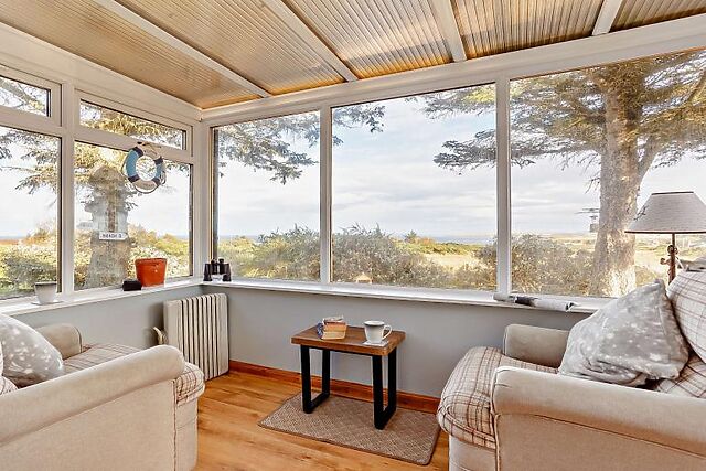 The ground floor living area is a relaxing space with a bright conservatory where you can sit and unwind with a good book or simply marvel at the glorious views. From here, step through to the inviting lounge with its plump sofa and chairs.