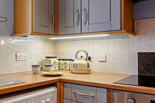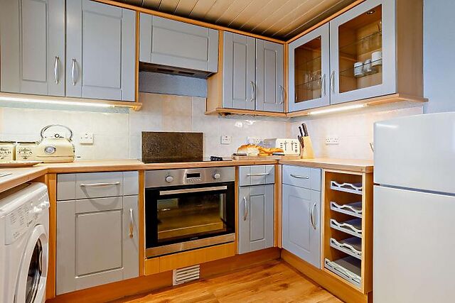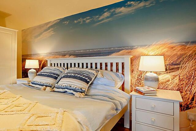 Leading off from here is a contemporary kitchen kitted-out with all the cooking utensils you’ll need for a comfortable stay. The master bedroom is located on this floor and features a double bed and a modern en-suite bathroom.