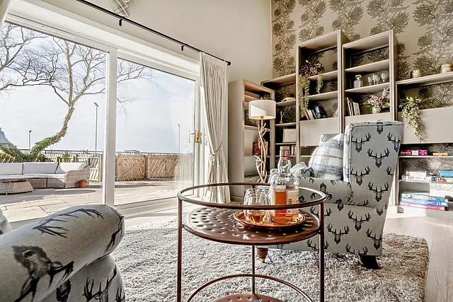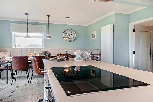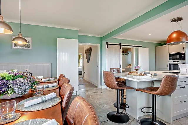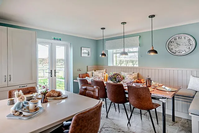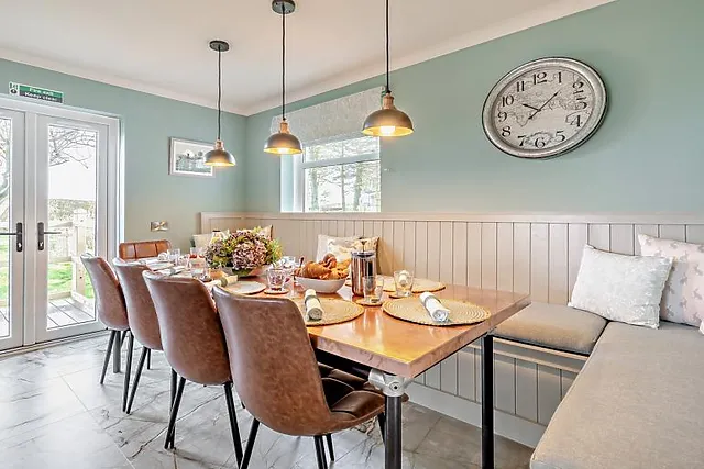 The gorgeous lounge offers comfy seating for everyone to gather around a cosy wood burner and a Smart TV for entertainment. Be sure to check out the thistle wallpaper and quirky brick fireplace.