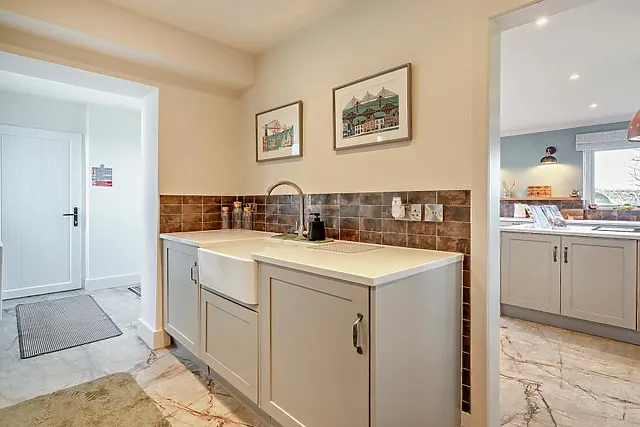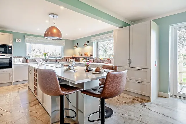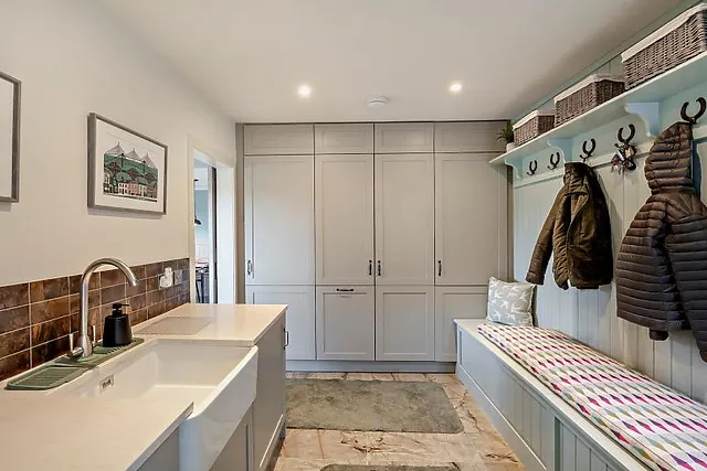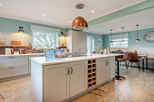 From here, huge patio doors open out to the garden. A large cloakroom and utility area help keep everyone's outdoor gear organised, ensuring the living spaces remain uncluttered.