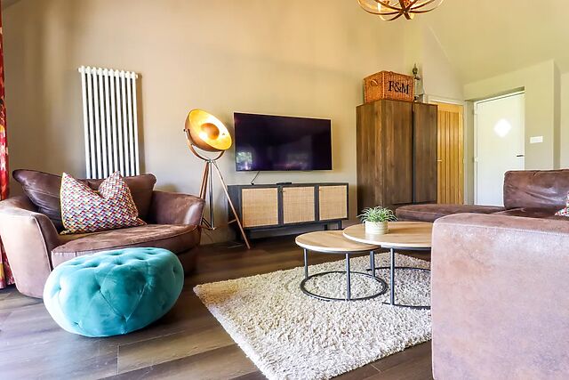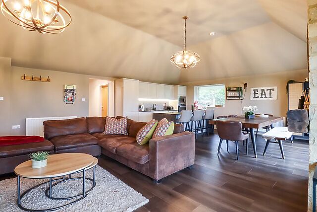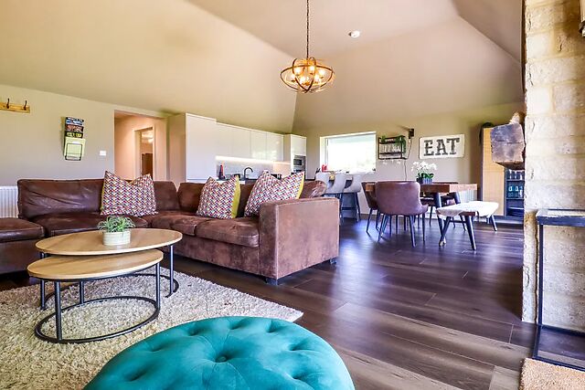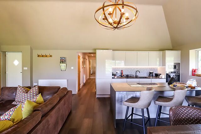 You'll find off-road parking for two cars on arrival, along with space for coats and boots by the front door. Make yourself right at home in the open-plan living space with high ceilings, chandeliers, and a sumptuous corner sofa to snuggle up in front of the Smart TV.