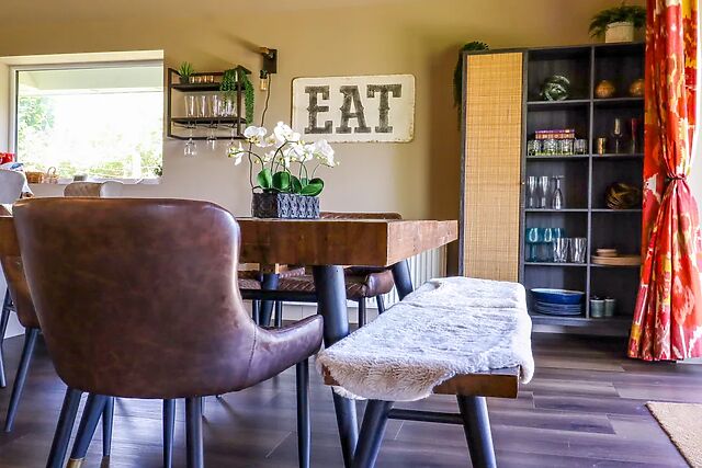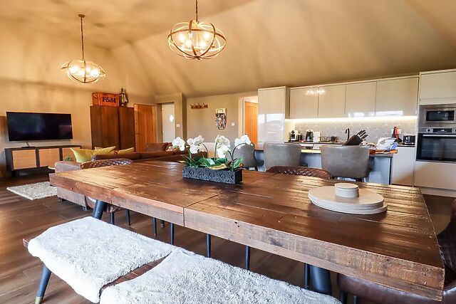 When it's time for dinner, the kitchen area is fully equipped with integrated facilities for you to rustle up your favourite home-cooked meals. There's a breakfast bar for three and a dining table to host family dinners by the warmth of the sleek electric fire.