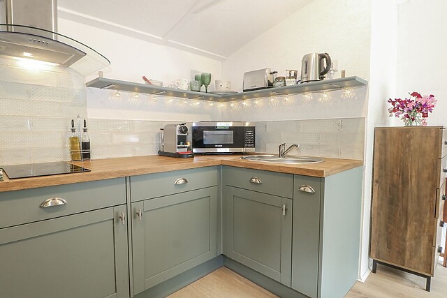 In the kitchen area, you have all you need for a self-catered stay with an electric hob and a combi microwave oven. Cook up a treat and head outside to dine on the picnic bench as you get distracted by the pretty countryside surroundings.