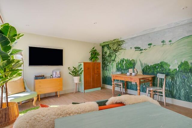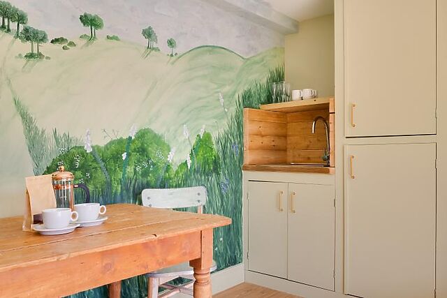 The open-plan lounge/diner features eclectic furniture and a hand-painted wall mural of the countryside, creating a warm and inviting atmosphere.