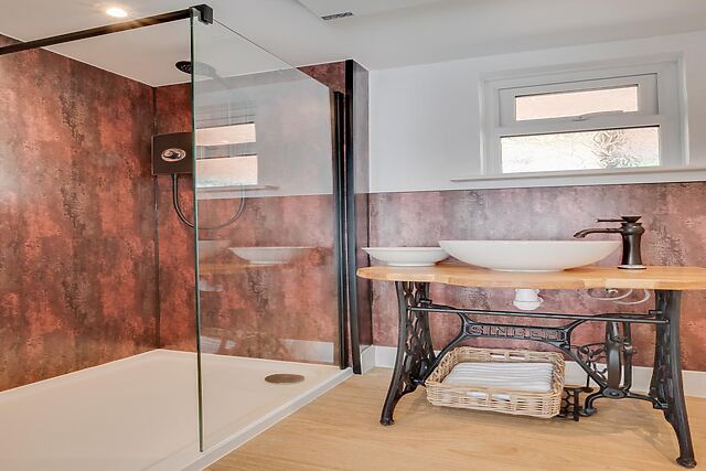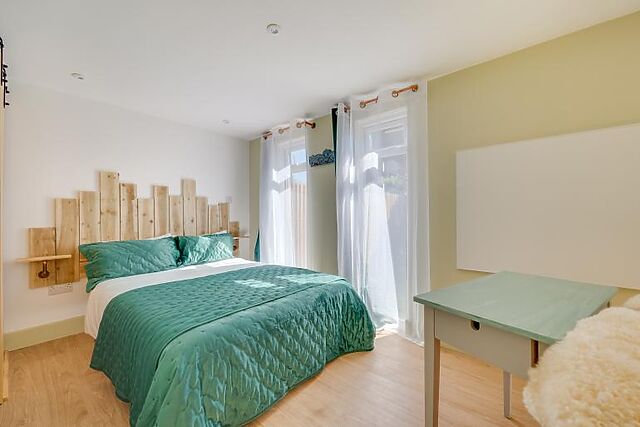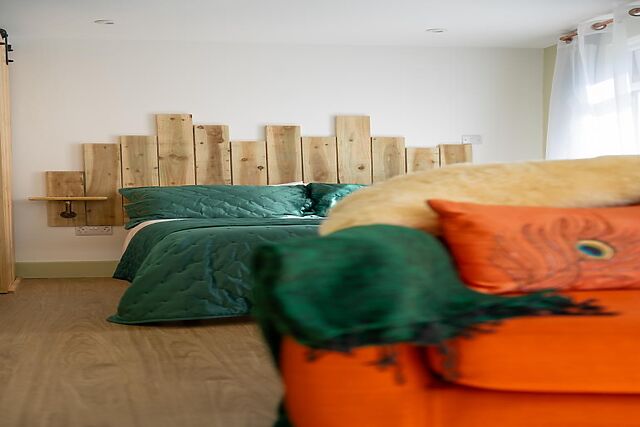 The Hideout boasts a spacious bedroom with a stylish bathroom, complete with a rainfall shower and a quirky sink made from an old Singer sewing table. Floor-to-ceiling windows flood the space with natural light, making it a delightful place to relax and unwind.