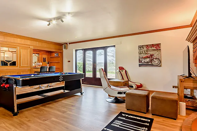 The property boasts a well-equipped games room featuring a multi-purpose games table, dartboard, and a bar, ensuring entertainment for all ages.