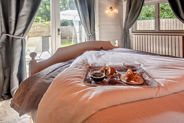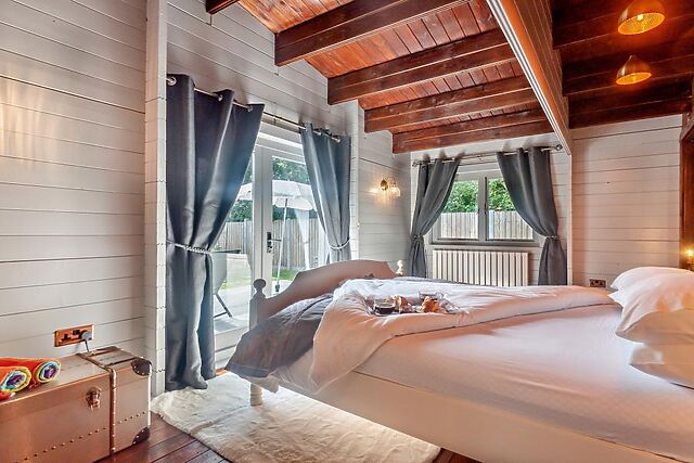 The lodge boasts two beautifully appointed bedrooms. A king-size with an en-suite shower room, and patio doors leading out to the garden, perfect for enjoying a morning tea or coffee in the sunshine.