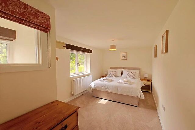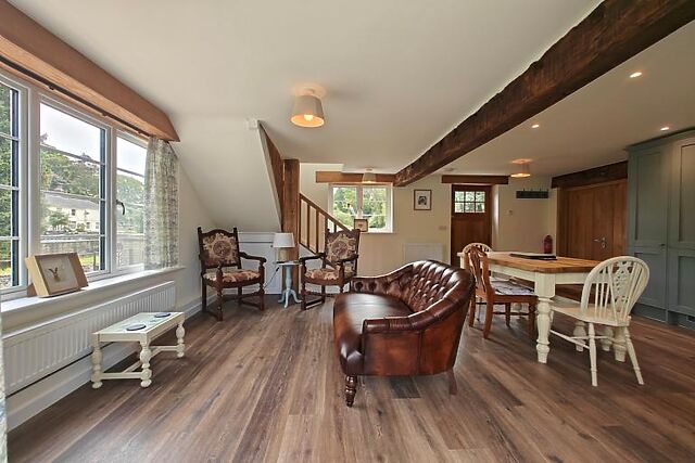 The open-plan living area combines rustic charm and modern comfort, with exposed beams, comfortable seating for four and a Smart TV – excellent for relaxed evenings. In the dining area, complete with a wooden-topped table, you can play board games and eat tasty meals, cooked up in the well-equipped kitchen which sits in one corner.