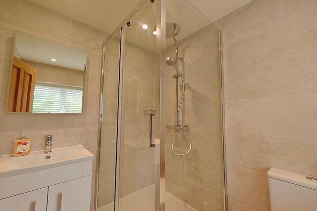 Upstairs, are two thoughtfully styled bedrooms along with a sleek modern shower room featuring a walk-in shower. Outside, relax in your own private hot tub on the private terrace, set up with seating, BBQ, and a dining table with chairs for laid-back moments surrounded by nature.