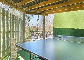 Enjoy the outdoor patio, complete with furniture and a hot tub, perfect for soaking up the views of the nearby Mermaid Gin Distillery vineyard. Beaches and local pubs are just a short walk away.