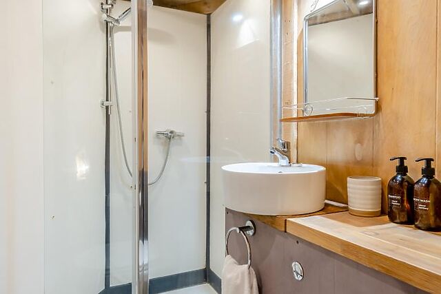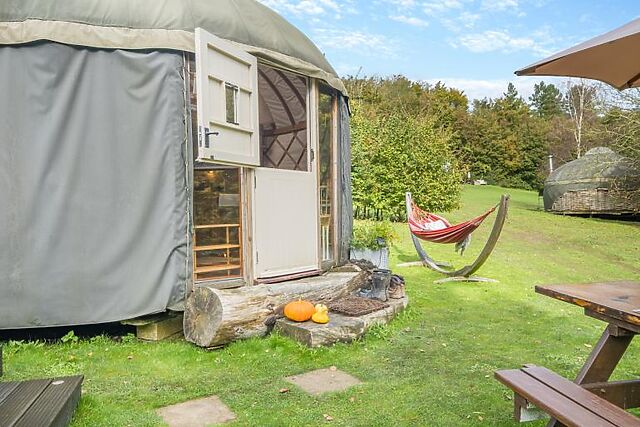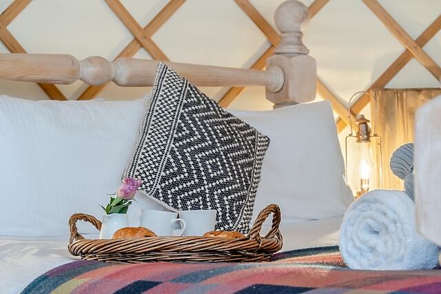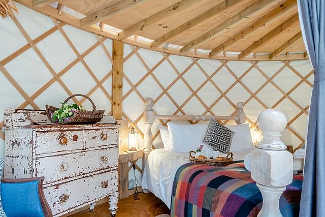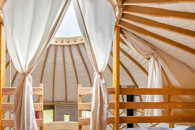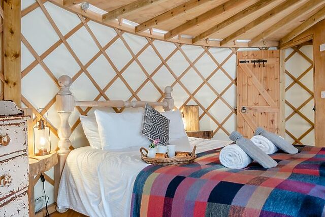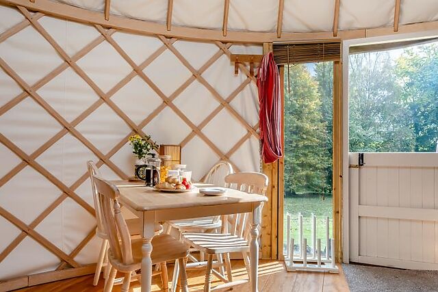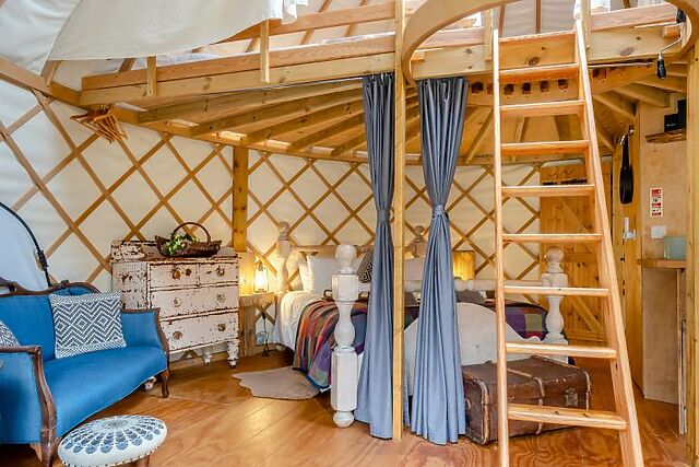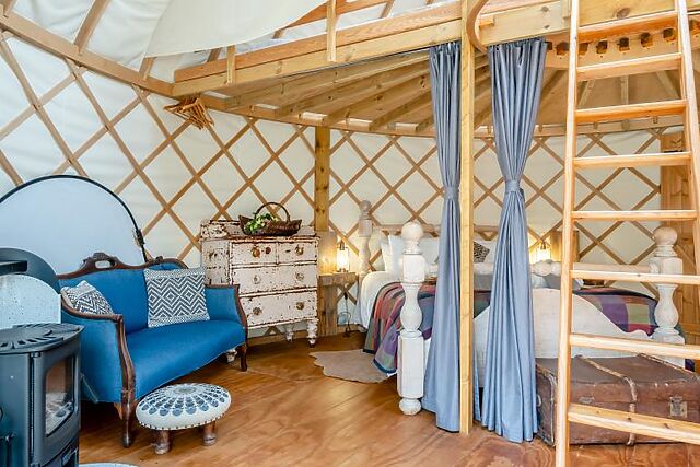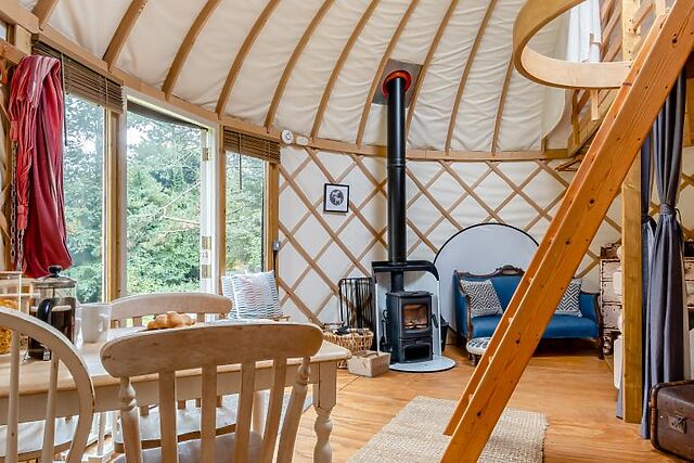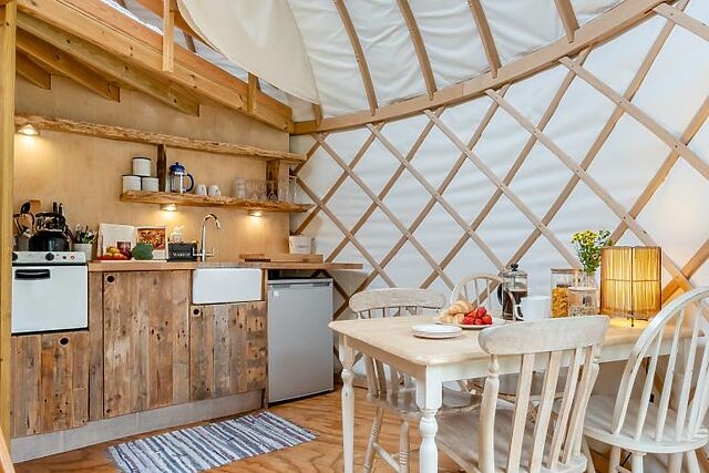 The yurt features a king-sized bed in the main area and two single mattresses on a mezzanine deck, accessed by a ladder. A fully equipped kitchen and dining area provide all you need for home-cooked meals.