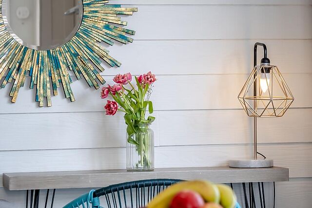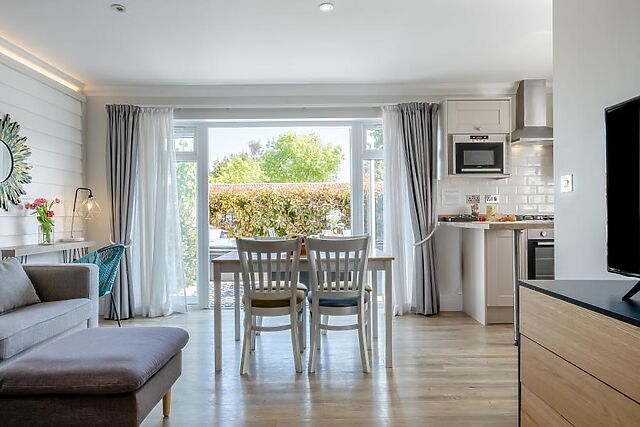 Seamlessly blending understated coastal themes with fresh colour palettes, this cosy haven is a delight for anyone seeking to relax on their travels. The kitchen space is compact yet fully fitted with all the necessities, and the central table makes it a great dining spot or place for board games.