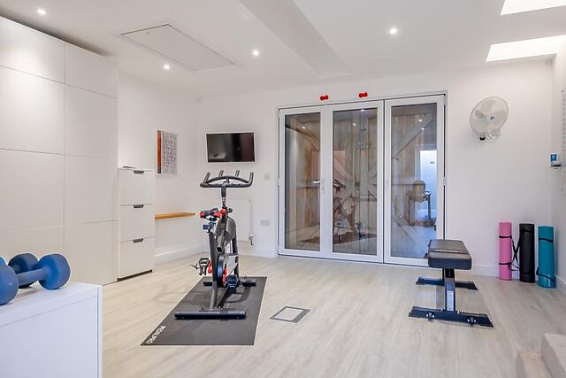 Adjacent to the living room is a games room that’s sure to delight both kids and adults, equipped with a foosball table and a classic 80s arcade games machine. For fitness enthusiasts, a well-appointed gym offers everything you need to keep active during your stay.