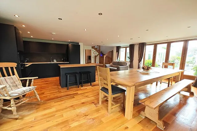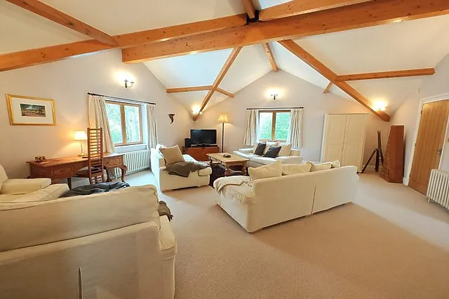 Sure to be at the heart of your daily activities, it has all the self-catering essentials plus a large table hand-crafted from an ancient oak that once grew on the estate. A small restroom is conveniently located adjacent to the kitchen, and an oak staircase leads to the upper floor, where three double bedrooms, a wet room and bathroom continue the comfort.