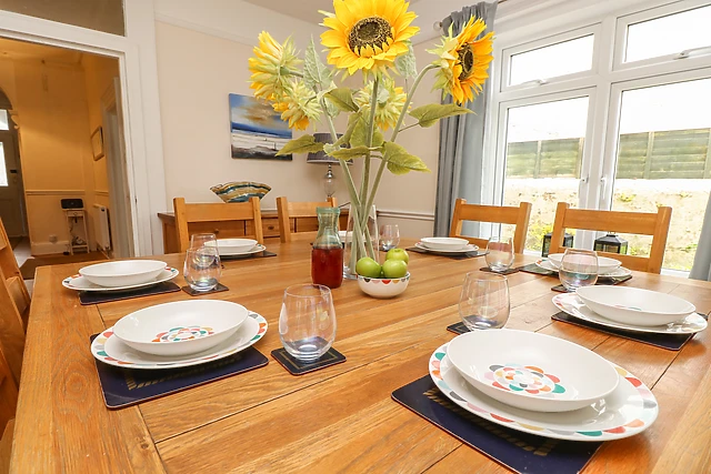 The cottage boasts an enclosed rear patio garden complete with outdoor furniture, providing a serene outdoor space for guests to enjoy the sea air and dine al fresco.