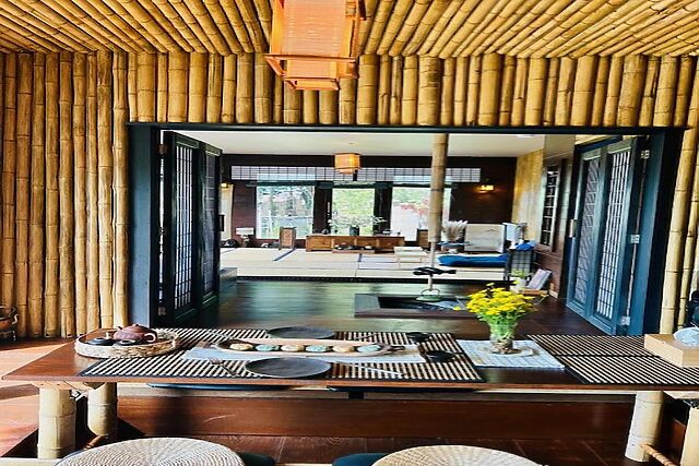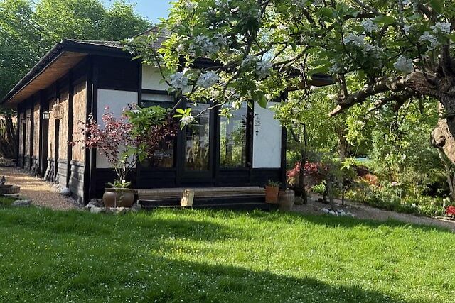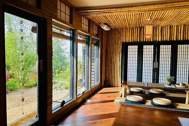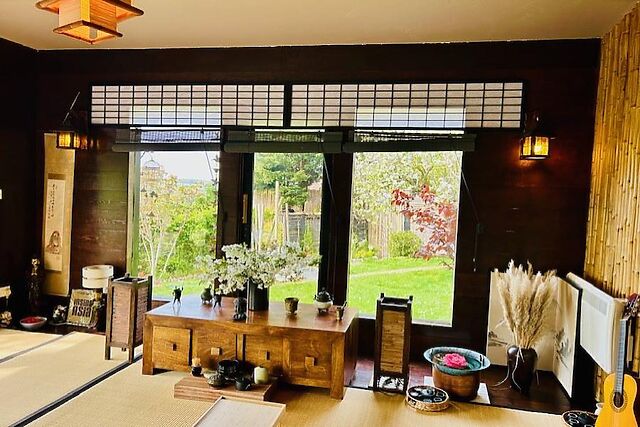 Inside, three warmly inviting rooms greet you, all set on one level. The bright and spacious lounge/ bedroom has a wooden floor and walls clad with timber and bamboo, and comes complete with traditional tatami mats and an open irori fire – a traditional Japanese sunken hearth (due to safety reasons, the owner must light it).