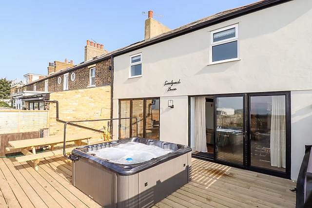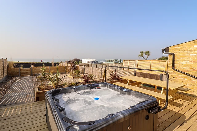 Yes, the property boasts a luxurious hot tub in the enclosed rear garden, perfect for relaxation and enjoying the coastal ambiance.