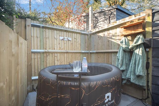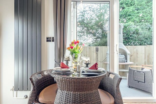 Outside, you’ll step onto a private terrace area complete with the Ninja wood-fired BBQ and sun loungers. There’s also your own hot tub in the cosy enclosed garden, where dogs will enjoy sniffing around.