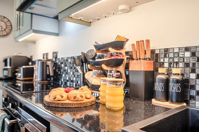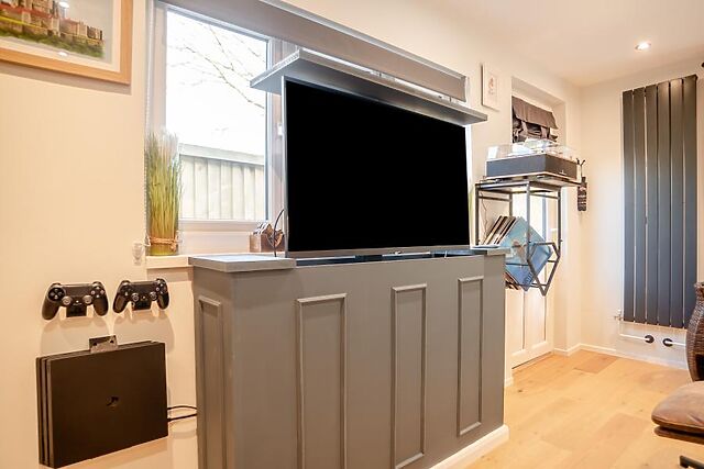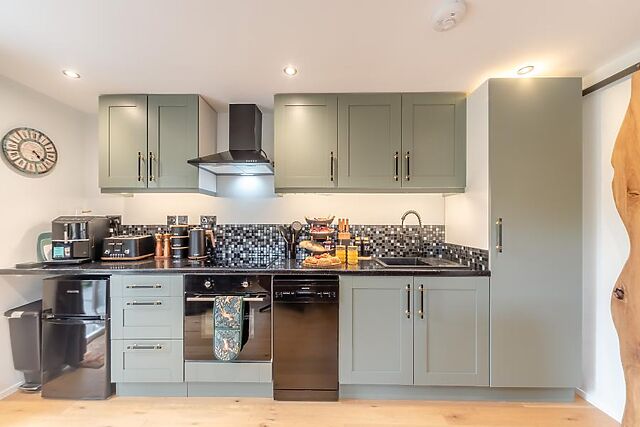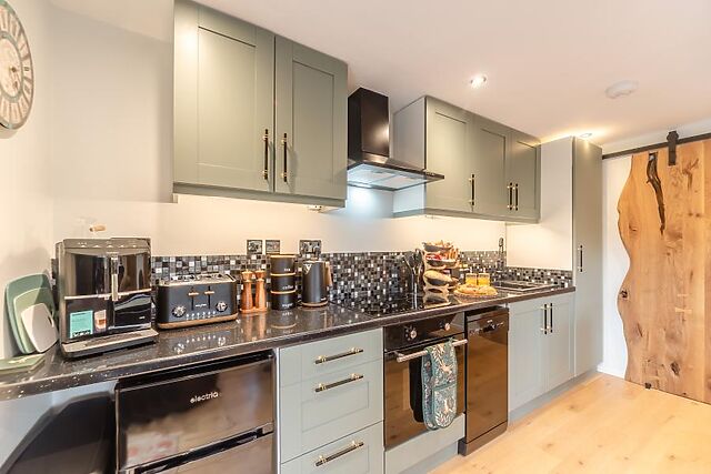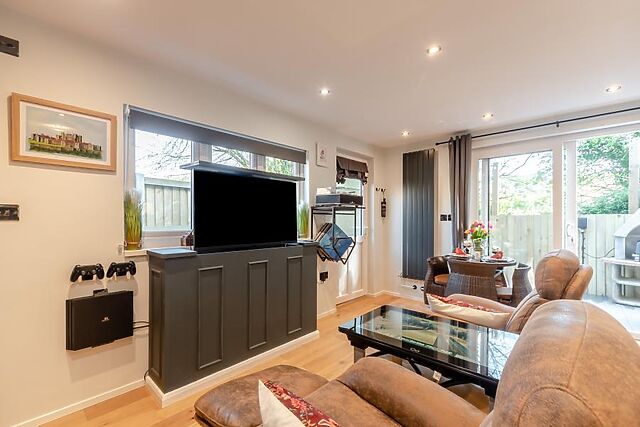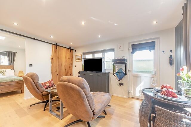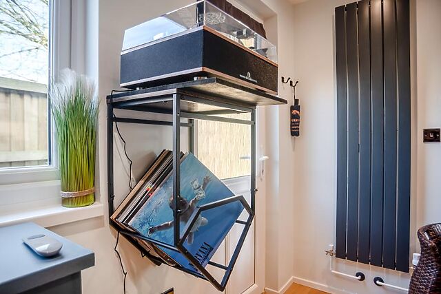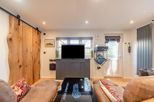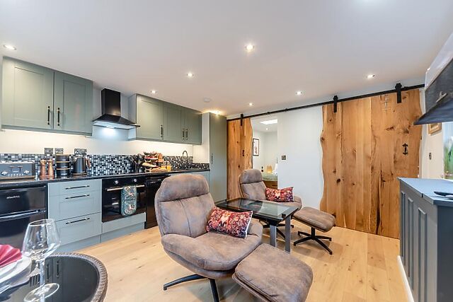 Sink back into the comfortable reclining chairs to watch the Smart TV, enjoy some gaming or just sit with your beloved (canine or human!) listening to the vinyl collection on the record player. Cleverly hidden behind quirky sliding wooden doors are the elegant double bedroom and the stylish shower room.