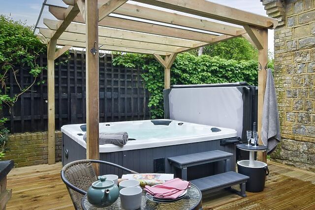 Yes, the property features a luxurious hot tub situated in the rear garden. It is covered by an overhead canopy, allowing guests to enjoy a warm soak in any weather, adding a touch of indulgence to their stay.