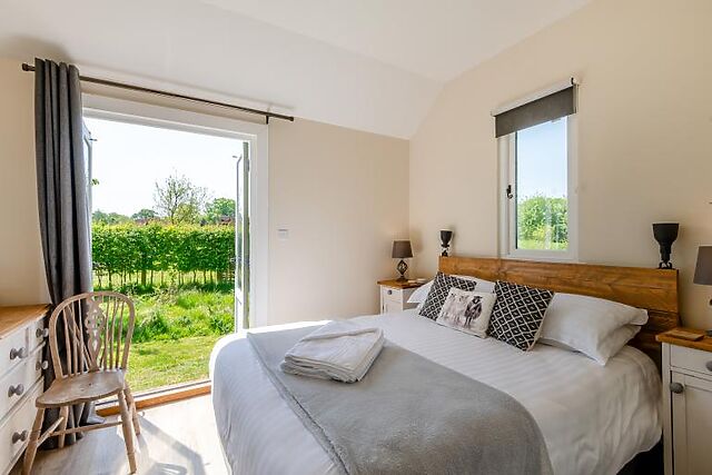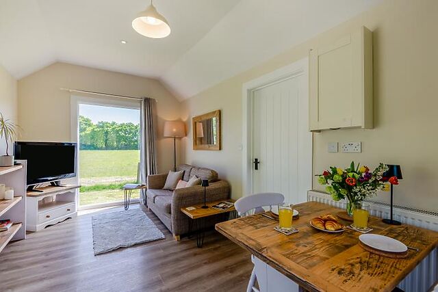 Each cabin is designed with bright and airy interiors, ensuring a cosy and welcoming atmosphere. The open-plan living areas are flooded with natural light, featuring comfy sofas, TVs, and large picture windows that frame stunning rural views.