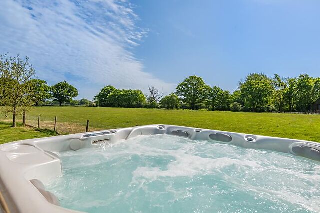 Outside, you’ll find a fenced garden with deck chairs, dining furniture, and a chiminea. The six-person hot tub, shared with a neighbouring property, is a perfect spot to soak and relax.