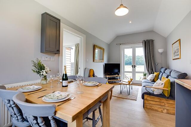The open-plan lounge, kitchen, and dining area provide a welcoming space to relax. Enjoy the rural views from the Scandi-style sofa and armchair, or step outside through the French doors to the private seating area.