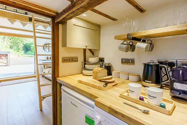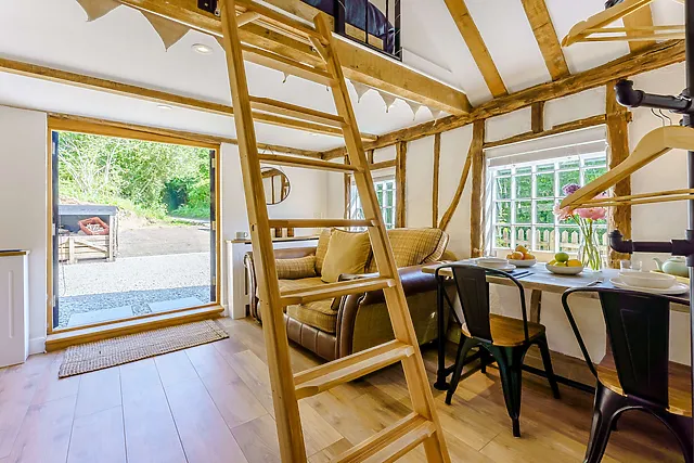 The accommodation sleeps two and features a cosy mezzanine bedroom with a king-size bed, ensuring a restful night's sleep.