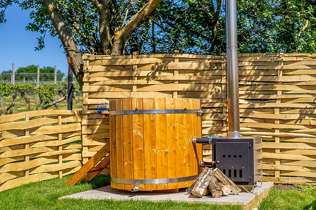 Yes, the accommodation boasts a wood-fired hot tub located in the secluded garden, offering guests a relaxing experience with stunning views over the vineyard.