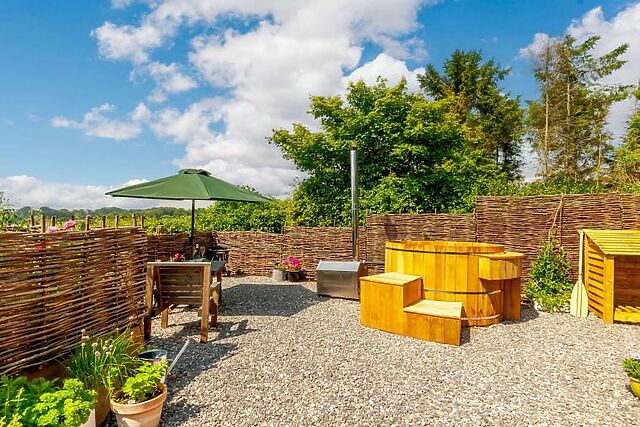 Yes, the accommodation features a wood-fired cedarwood hot tub, providing a luxurious and relaxing experience with stunning views of the surrounding countryside.