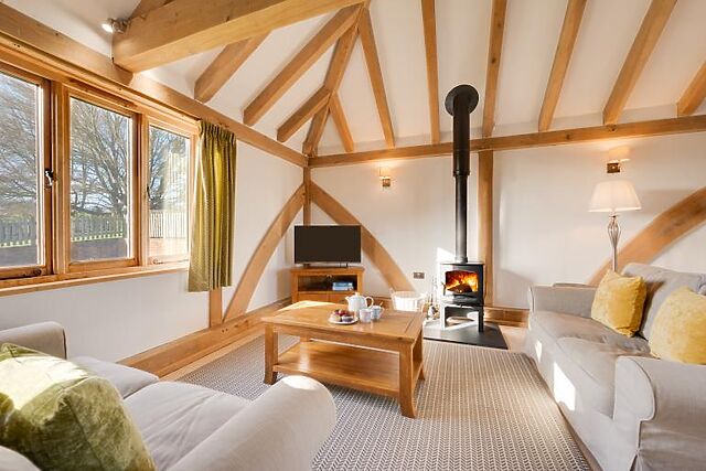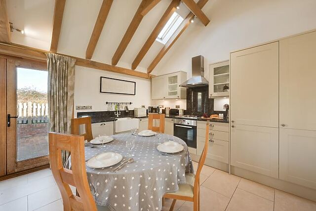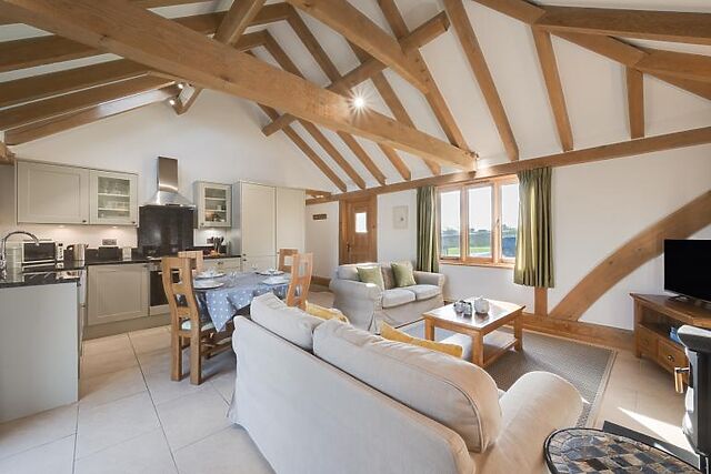 You will be enchanted by the bright and airy interiors, complete with original beams and a stunning vaulted ceiling. The open-plan living area is perfect for socialising, with a fully equipped kitchen, dining space, and a cosy wood burner with an unlimited supply of logs.