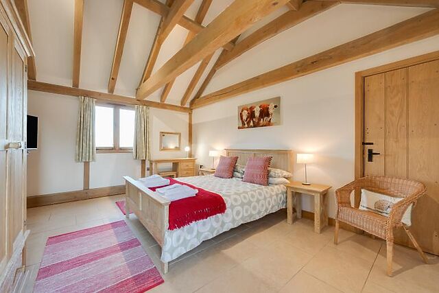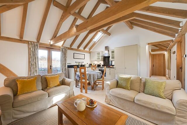 Churchlands Barn in Tenterden, Kent, is a stunning barn conversion that sleeps up to eight people. This luxurious accommodation offers an open-plan design, galleried landing, and vaulted ceilings, creating a spacious and airy environment.