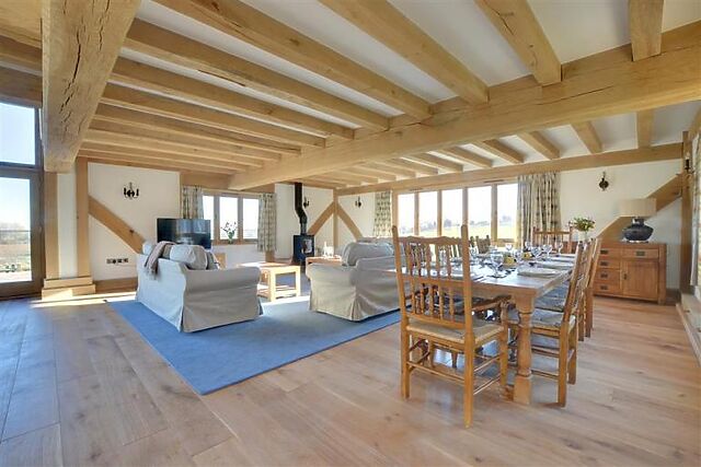 Churchlands Barn in Tenterden, Kent, is a stunning barn conversion that sleeps up to eight people. This luxurious accommodation offers an open-plan design, galleried landing, and vaulted ceilings, creating a spacious and airy environment.