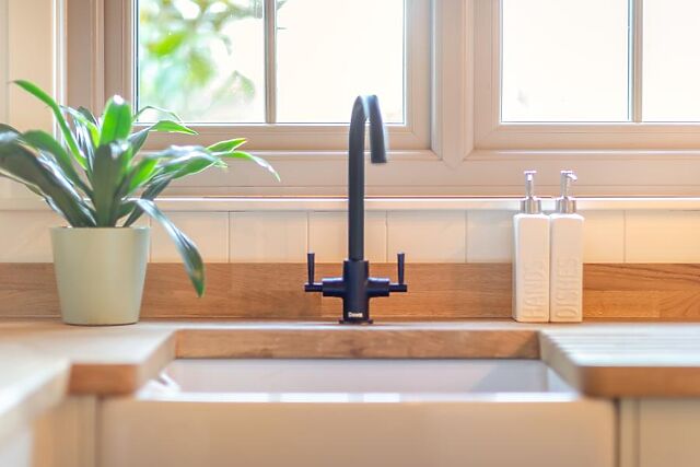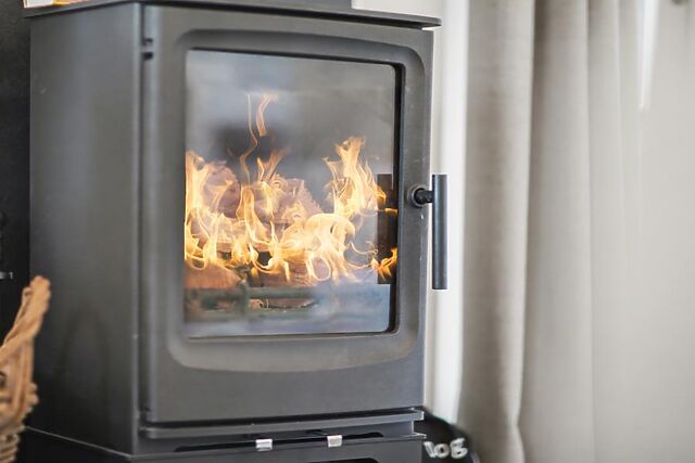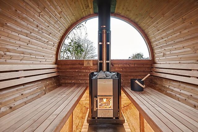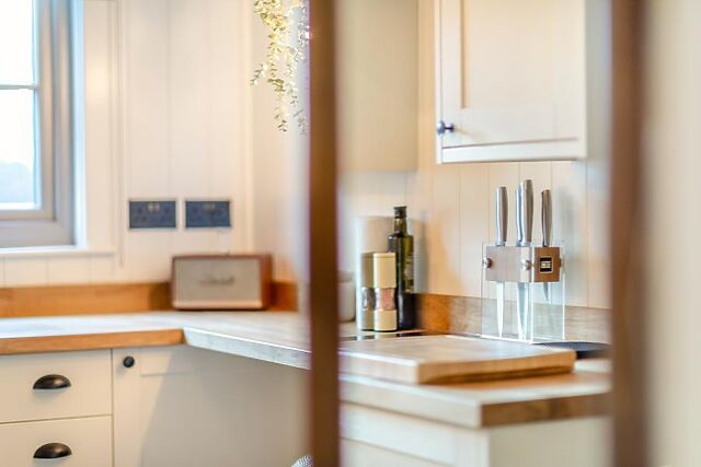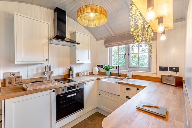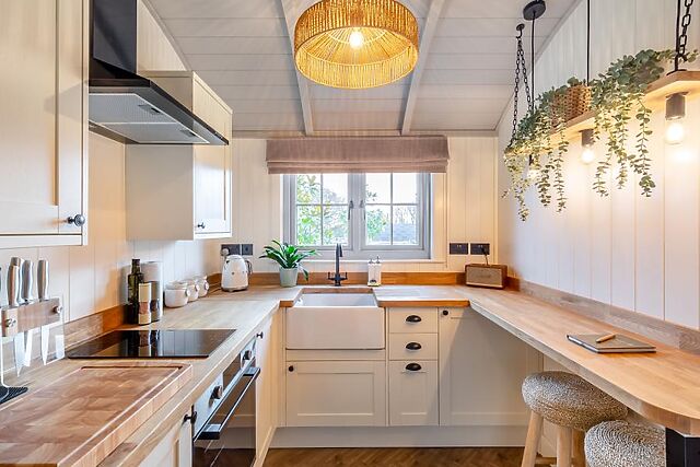 Once inside, the stunning open-plan social space has chic Scandi styling, with a choice of soft seating arranged before a wood burner and Smart TV. To one end, the kitchen is sleek and contains all the self-catering essentials, with bar-style seating so you can chat over drinks while dinner cooks.