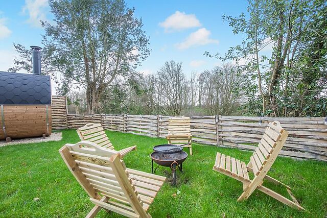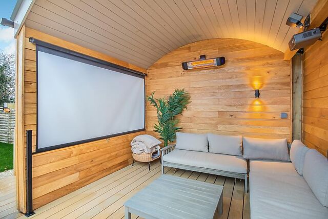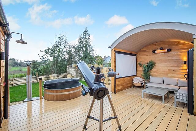 A sleek shower room serves the two bedrooms – both have a king-size bed and Smart TV, and one has patio doors affording direct access onto the decked area. A fully enclosed garden area extends your living space; for movie nights with a difference, stretch out on the sofa in the outdoor cinema – heaters will keep you warm, and the screen is huge!