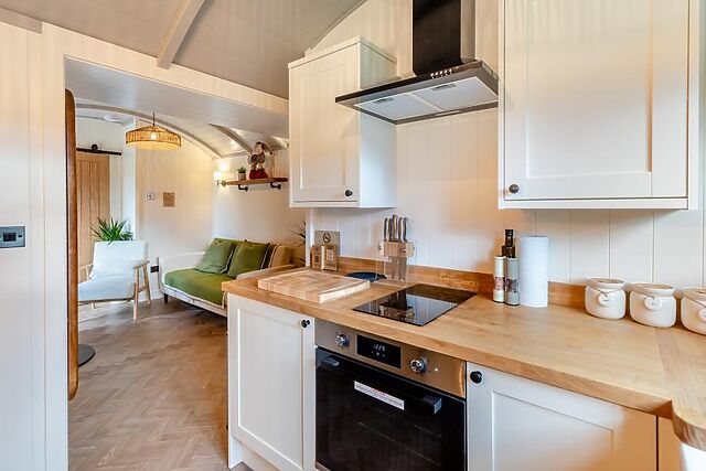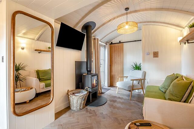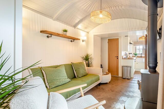 This high-end shepherd’s hut is one of an exclusive cluster of holiday homes that nestle beneath towering trees in a peaceful rural location. Private parking allows you to unpack at your own pace.