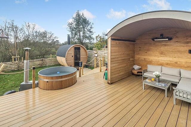 A fully enclosed garden area extends your living space – for movie nights with a difference, stretch out on the sofa in the outdoor cinema, where heaters will keep you warm and the screen is huge! Across the decked area, there’s a wood-fired hot tub and a sauna.