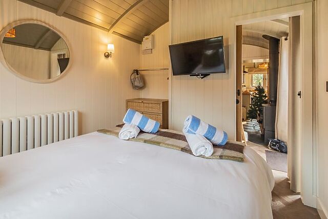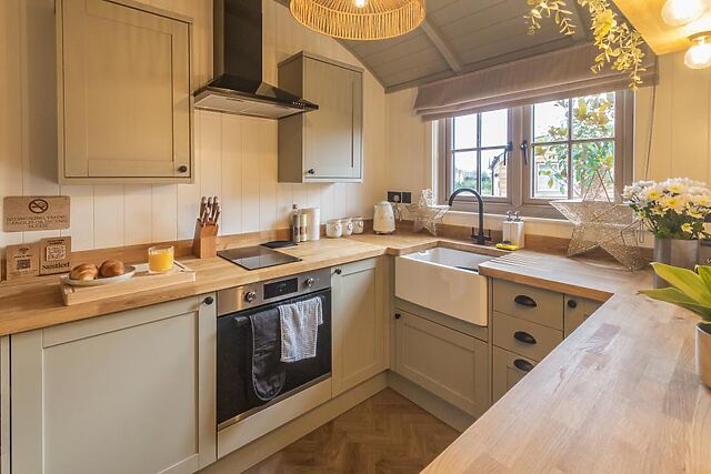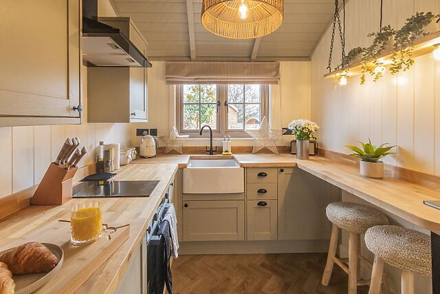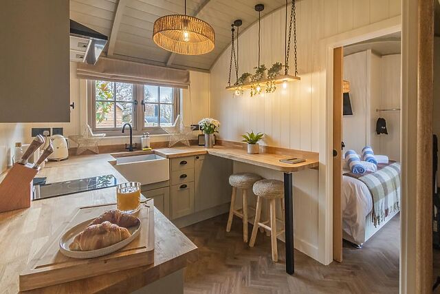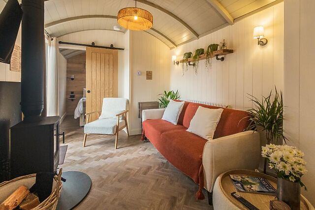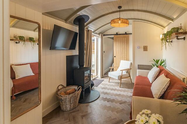 Nearby parking allows you to unpack at your own pace. Once inside, the stunning open-plan social space has chic Scandi styling, with a natural colour palette and a choice of soft seating arranged before a wood burner and Smart TV.