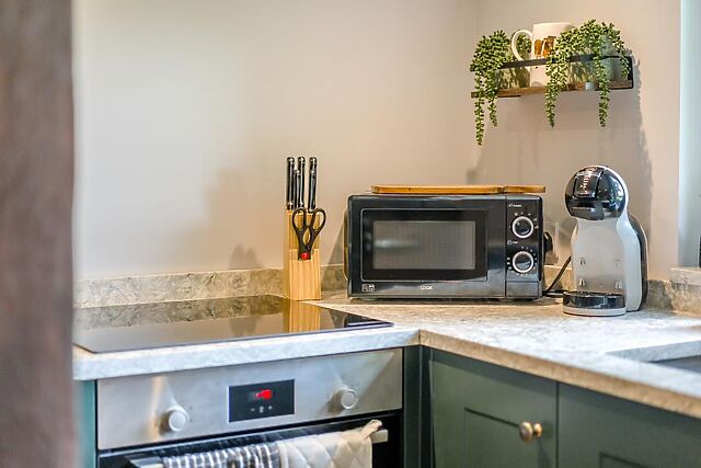 Step through the front door and into the inviting open-plan living space, with striking structural beams and a super-cosy ambience. Soak up the scenic views as you prepare a romantic meal for two in the stylish kitchen, take your seats at the dining suite and chat about your day’s adventures, then stretch out before the contemporary wood burner on a choice of comfortable lounge seating.