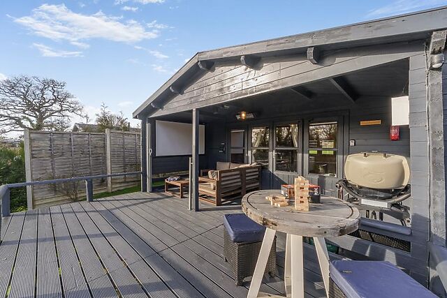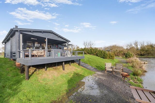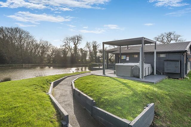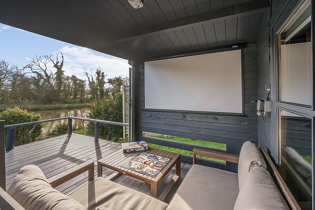 When you’re ready to start the next day, the sleek shower room is conveniently close for fresh morning soaks. Double patio doors open onto a covered decked area which overlooks the lake and has outdoor lounge-style furniture.