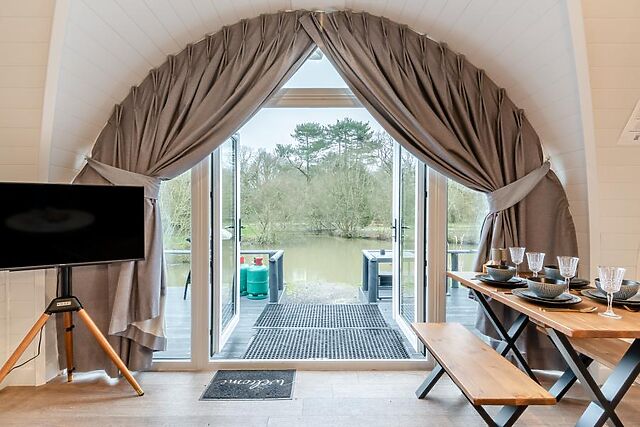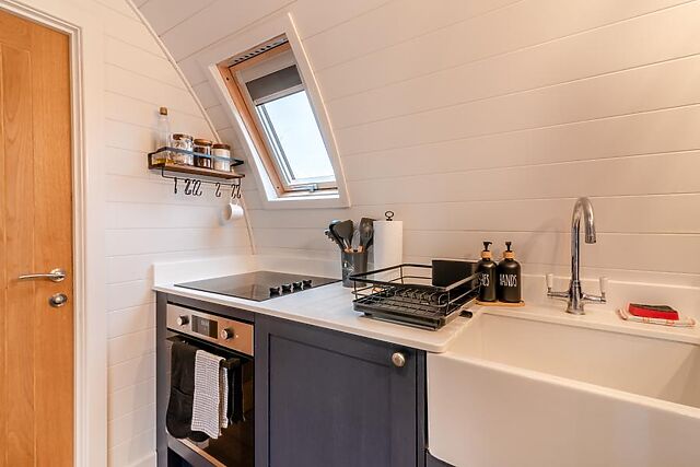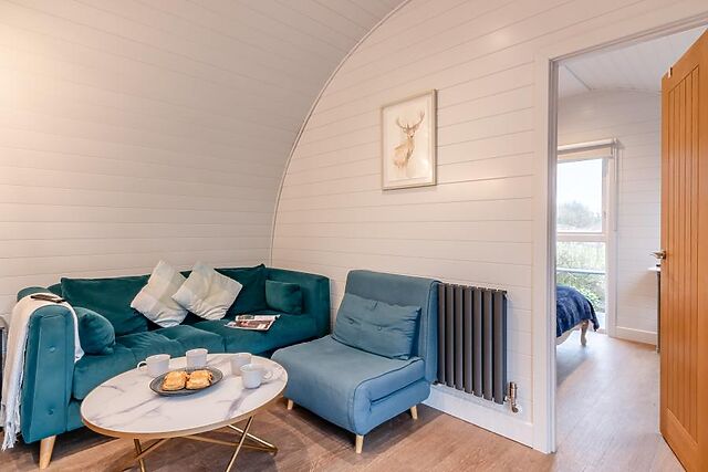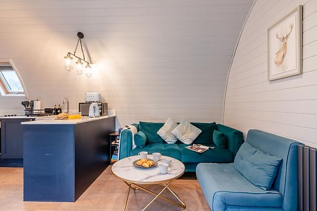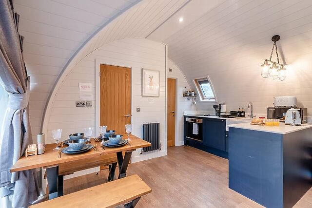 Sink into the plush seating while catching up on your favourite shows on the Smart TV, or gather around the table for relaxed meals prepared in the well-equipped kitchen. The pod offers two king-size bedrooms with sweeping wooden ceilings arching overhead, and a contemporary shower room, providing comfortable accommodation and a good night’s sleep for all.