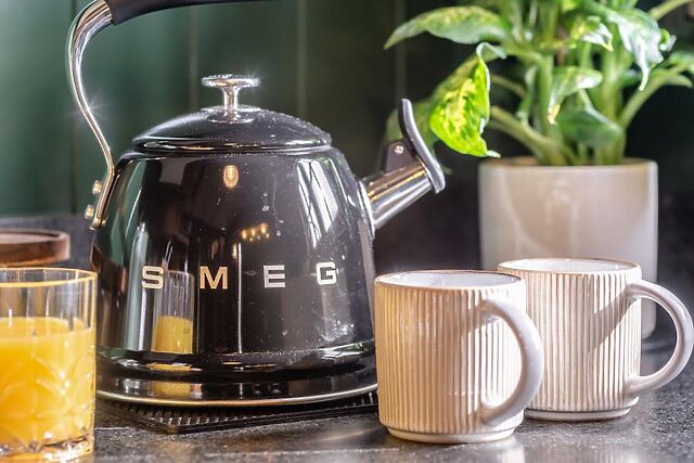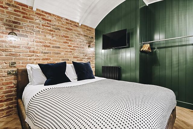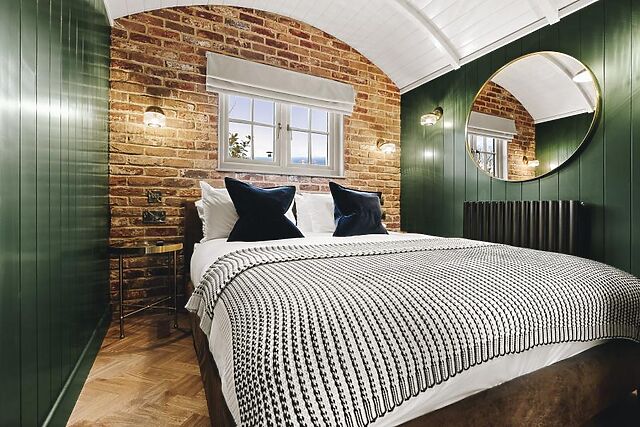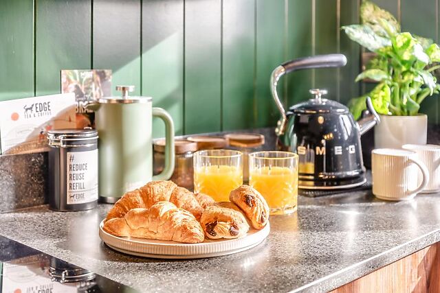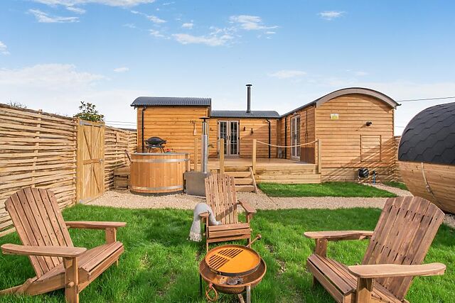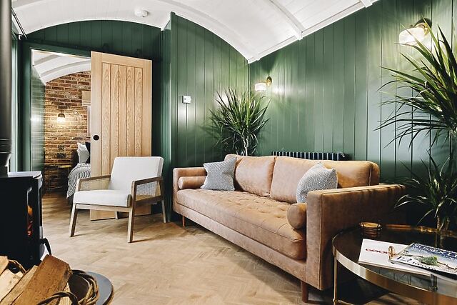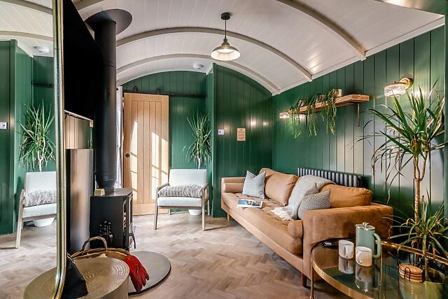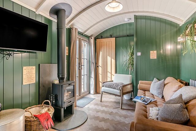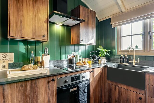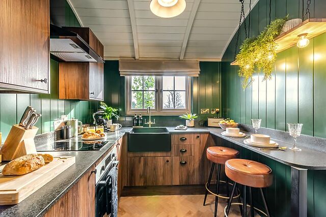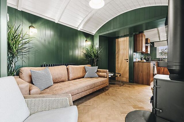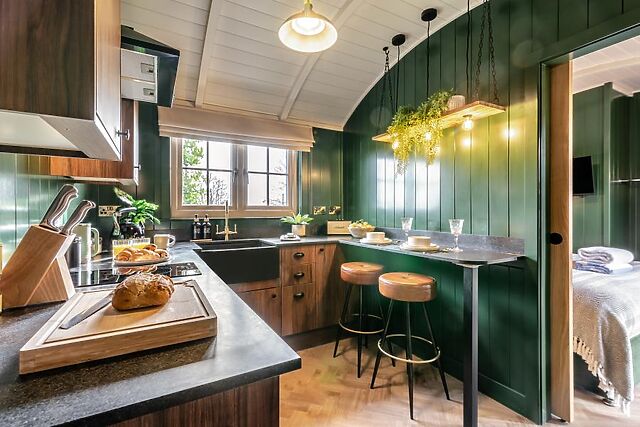 Once inside, the U-shaped shepherd’s hut-style property has a stunning open-plan social space, with a bold colour palette and choice of soft seating arranged before a wood burner and Smart TV. To one end, the kitchen is sleek and contains all the self-catering essentials, with bar-style seating so you can chat over drinks while dinner cooks.