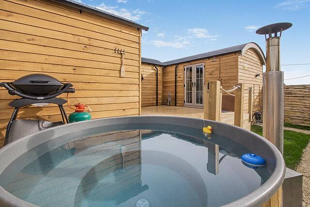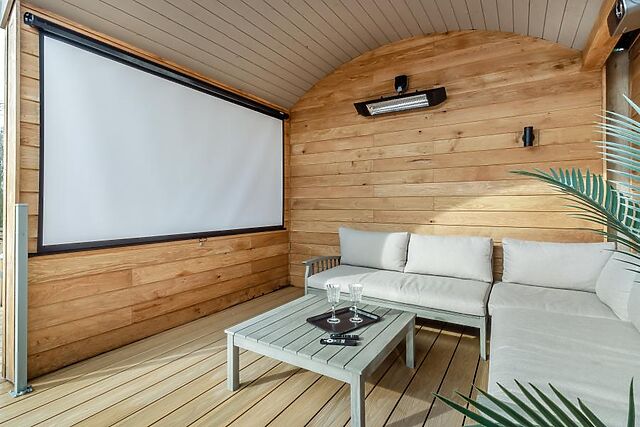 A chic shower room serves the two bedrooms, both of which boast king-size beds and Smart TVs for lazy mornings – one has patio doors for direct access onto the decked area. Your living space extends into a fully enclosed garden, where you’ll find a covered cinema area with patio heaters, sofa-style seating and a large screen.