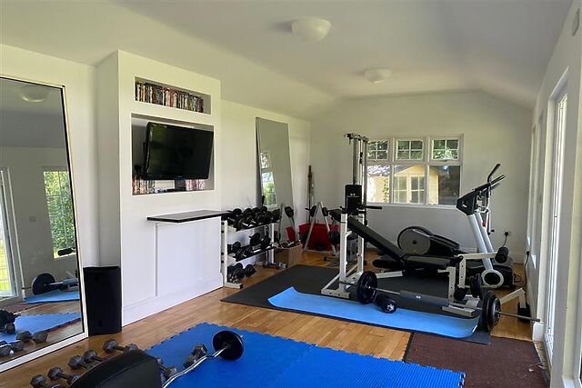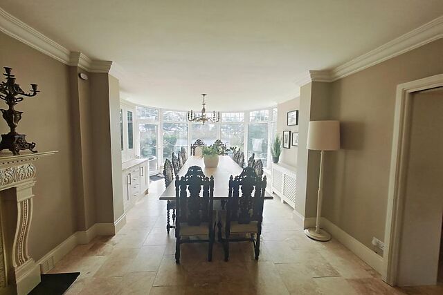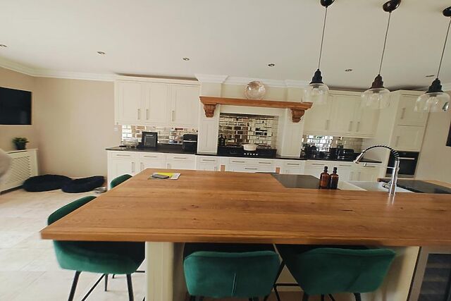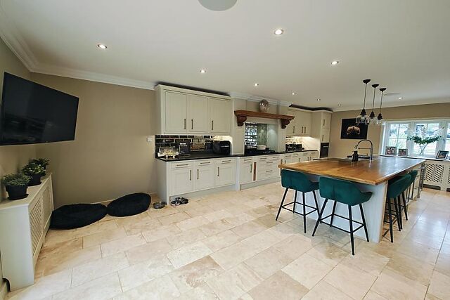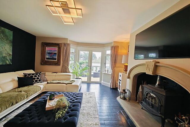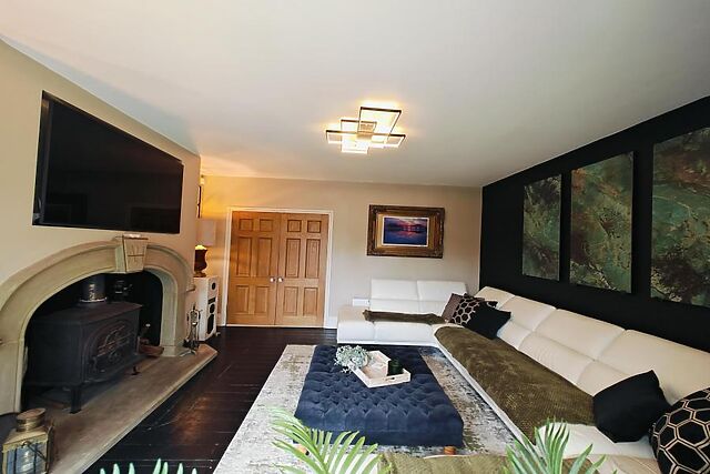The dining room, with large windows, is right in front of you, featuring a 12-seater dining table perfect for celebratory meals with family and friends.Light the woodburner for an extra cosy feel. Adjacent to this, the spacious kitchen serves as the central hub of family life, complete with a central island with 6 bar stools, A four seater sofa, high-quality Miele appliances, Miele coffee machine and a Smart TV.