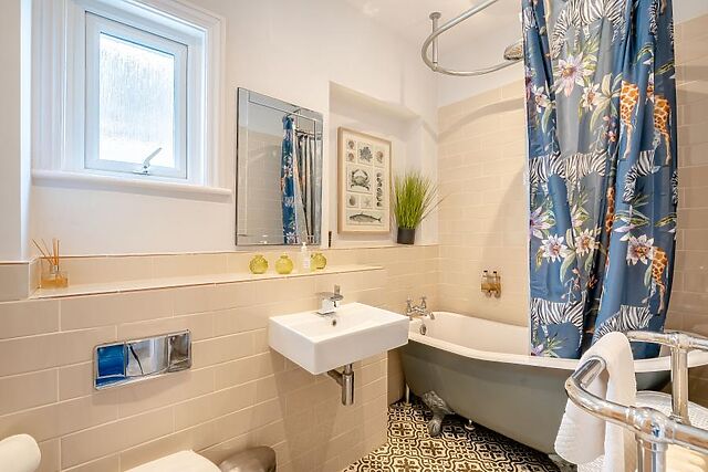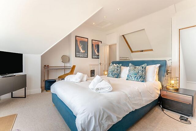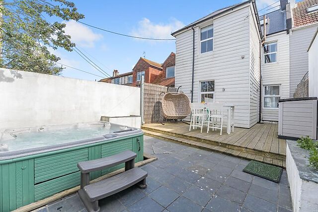 The king-size room at the front of the property boasts panoramic views of the Sussex coastline and features a low-level toddler bed. There is also a further king-size bedroom at the rear of the property and a twin bedroom.
