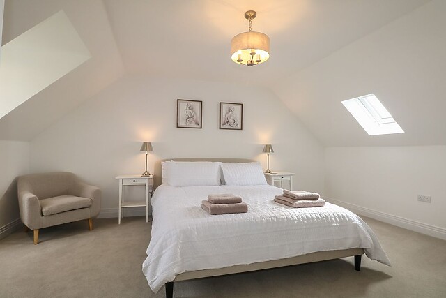 The super-king-size bedroom features a Smart TV, a dressing area, and an en-suite bathroom with a bath and separate shower, an ideal place to unwind in luxury. The first floor also hosts a king-size bedroom and a double bedroom, the latter with its own en-suite for added privacy.