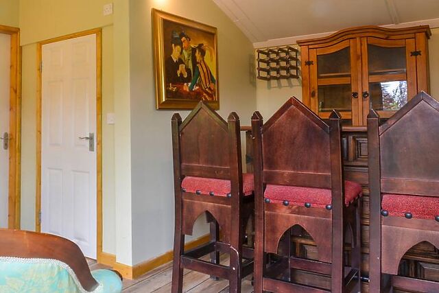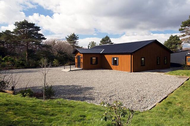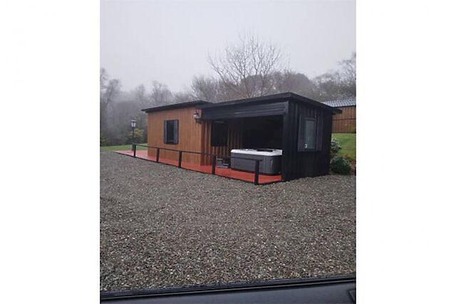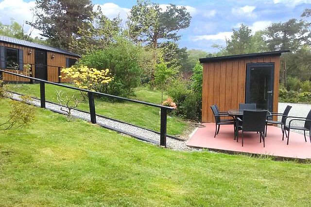Inside the main lodge, you'll find a welcoming lounge with a wood burner, large windows, and a smart kitchen with a characterful wooden dining table. The lodge includes a double bedroom with an en-suite shower room and a spacious twin bedroom.