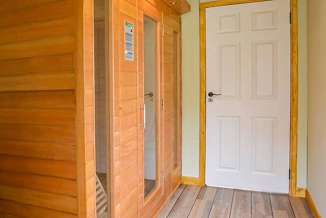 Relax in the private sauna and hot tub, or enjoy the enclosed, landscaped grounds with a stream and patio for al fresco dining. The property also includes a lockable shed for storing outdoor equipment, ensuring you have everything you need for a comfortable stay.