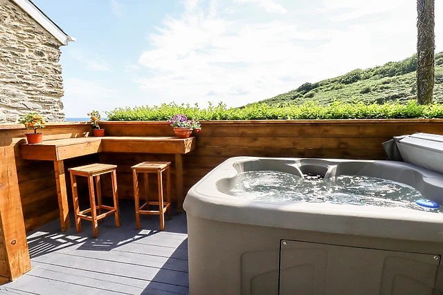 Yes, the cottage features a private hot tub in the courtyard, offering a secluded spot for relaxation with a view of the sea.