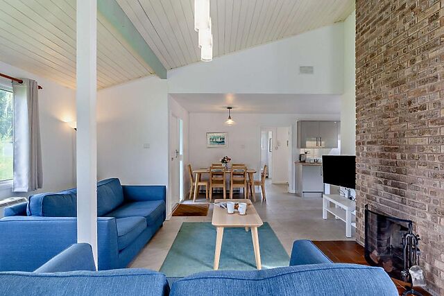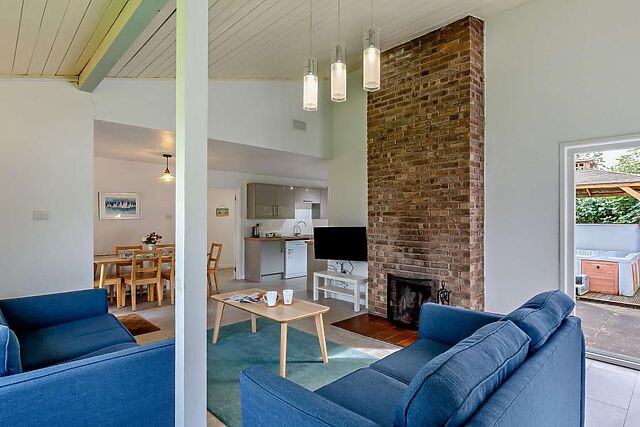 - The lodge is arranged over one level, with modern décor and generous windows creating a light-filled atmosphere. - The open-plan living area is spacious and welcoming, featuring a comfortable sofa and an open fireplace.